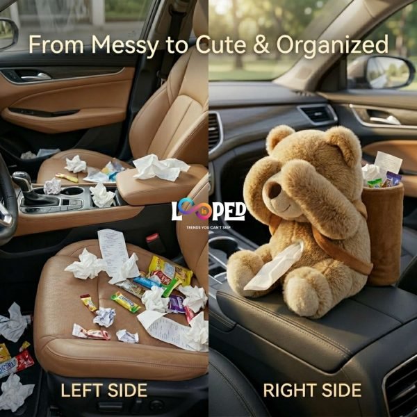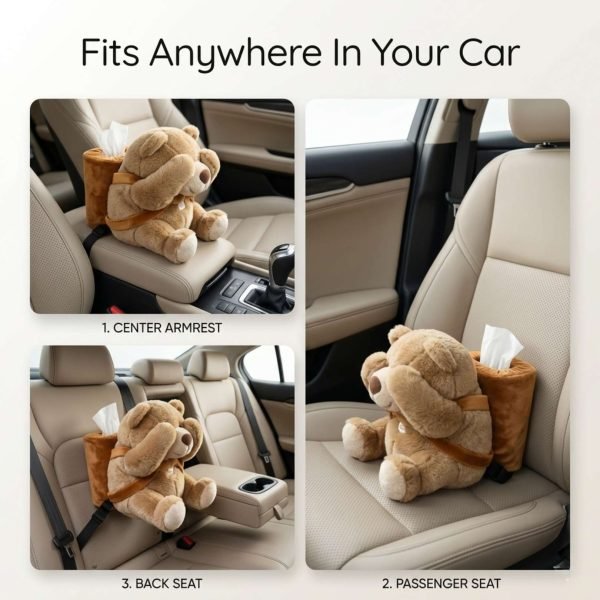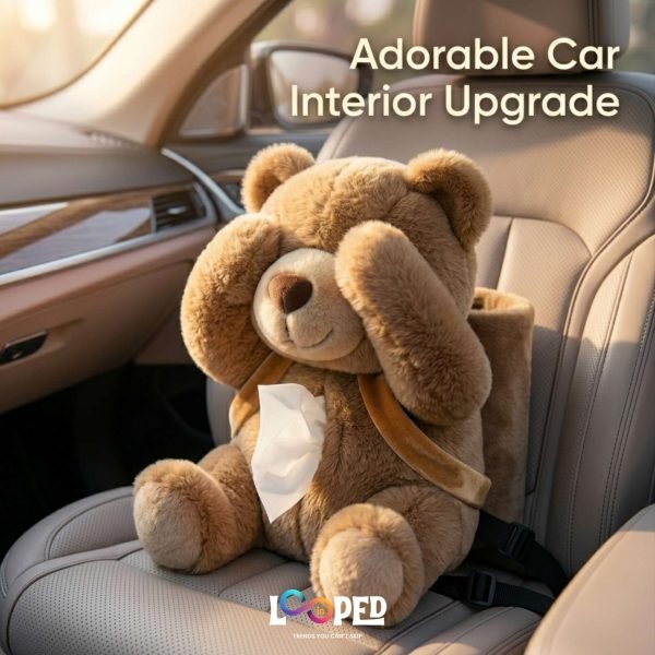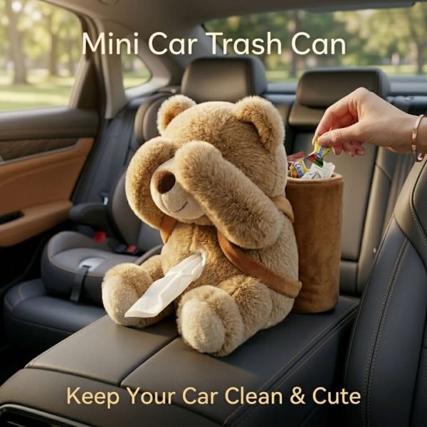 Adorable bear-themed car accessory designed to keep your vehicle neat and organized while adding a cute decorative touch. It functions as both a tissue holder and a small trash bin, providing a convenient solution for managing waste and keeping tissues easily accessible during travel.