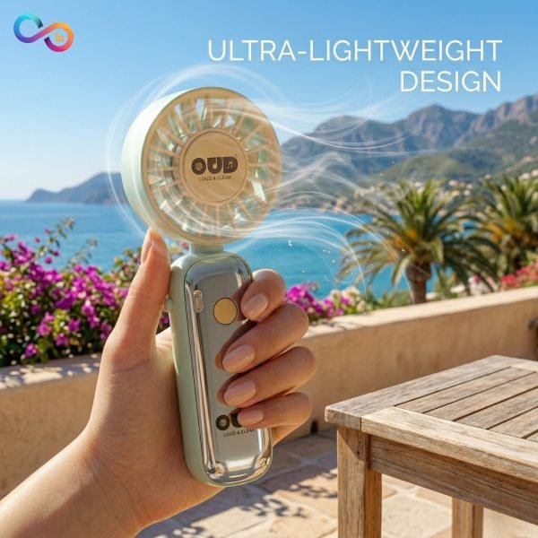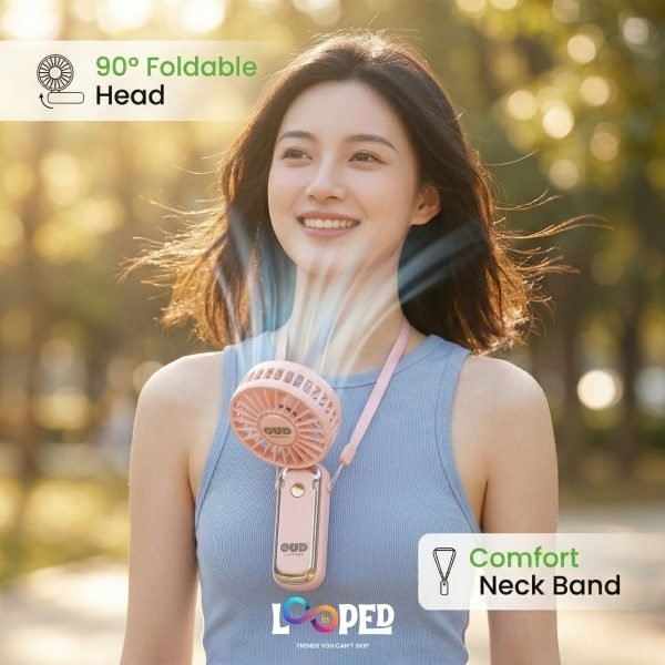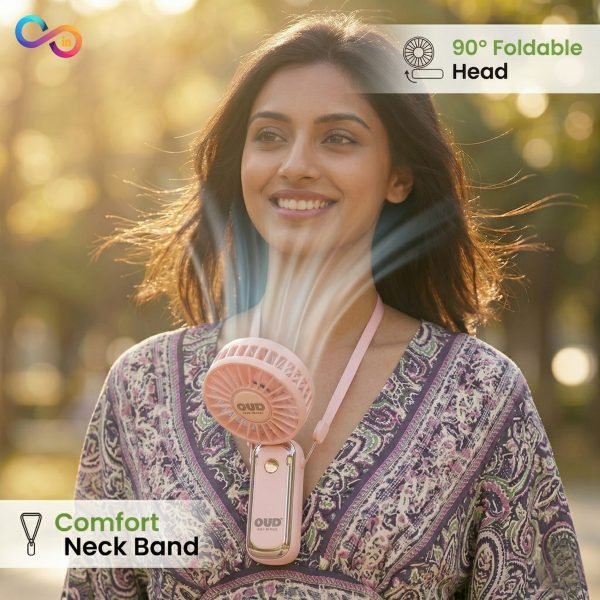 Foldable hands-free neck fan designed for convenient and comfortable personal cooling. Worn around the neck, it allows you to stay cool without holding a device, making it ideal for travel, outdoor activities, work, or daily use.