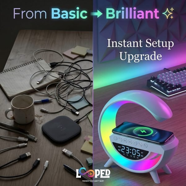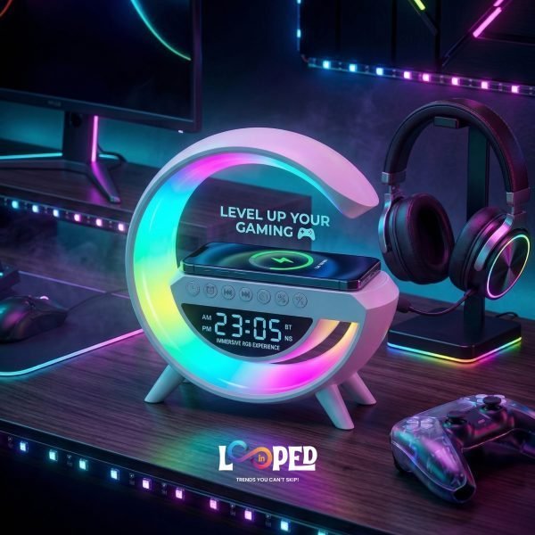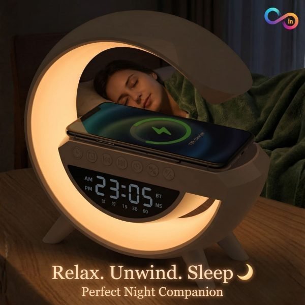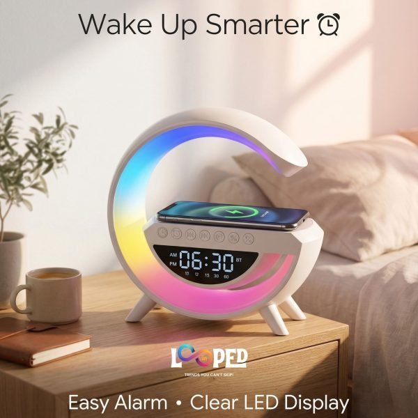 - Modern G-Shape Design: Eye-catching futuristic design works as a lamp, speaker, charger, and décor piece, making it perfect for home, office, or gifting.
