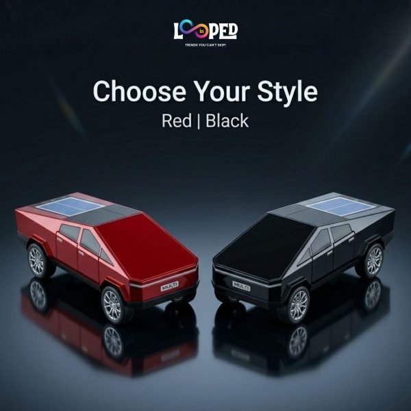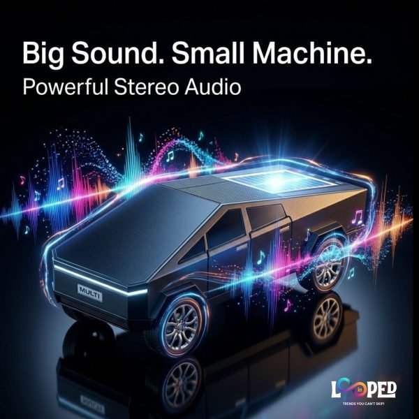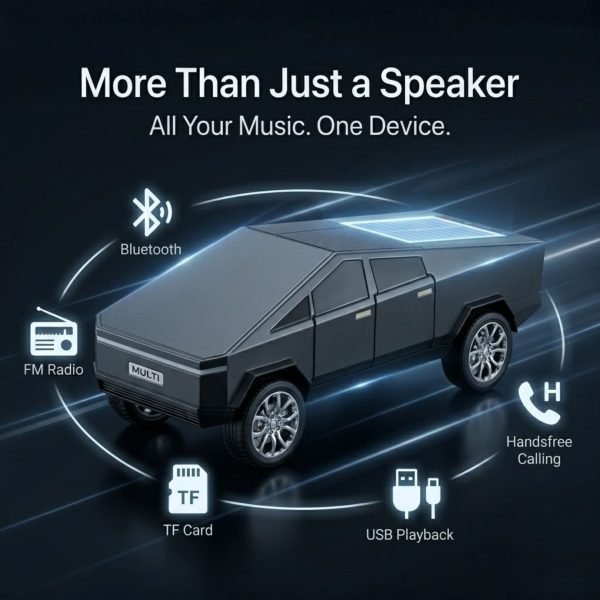 Futuristic Cybertruck-inspired Bluetooth speaker designed to deliver modern style with practical functionality. Its bold, angular design gives it a unique and eye-catching look, making it stand out as both a speaker and a decorative piece.